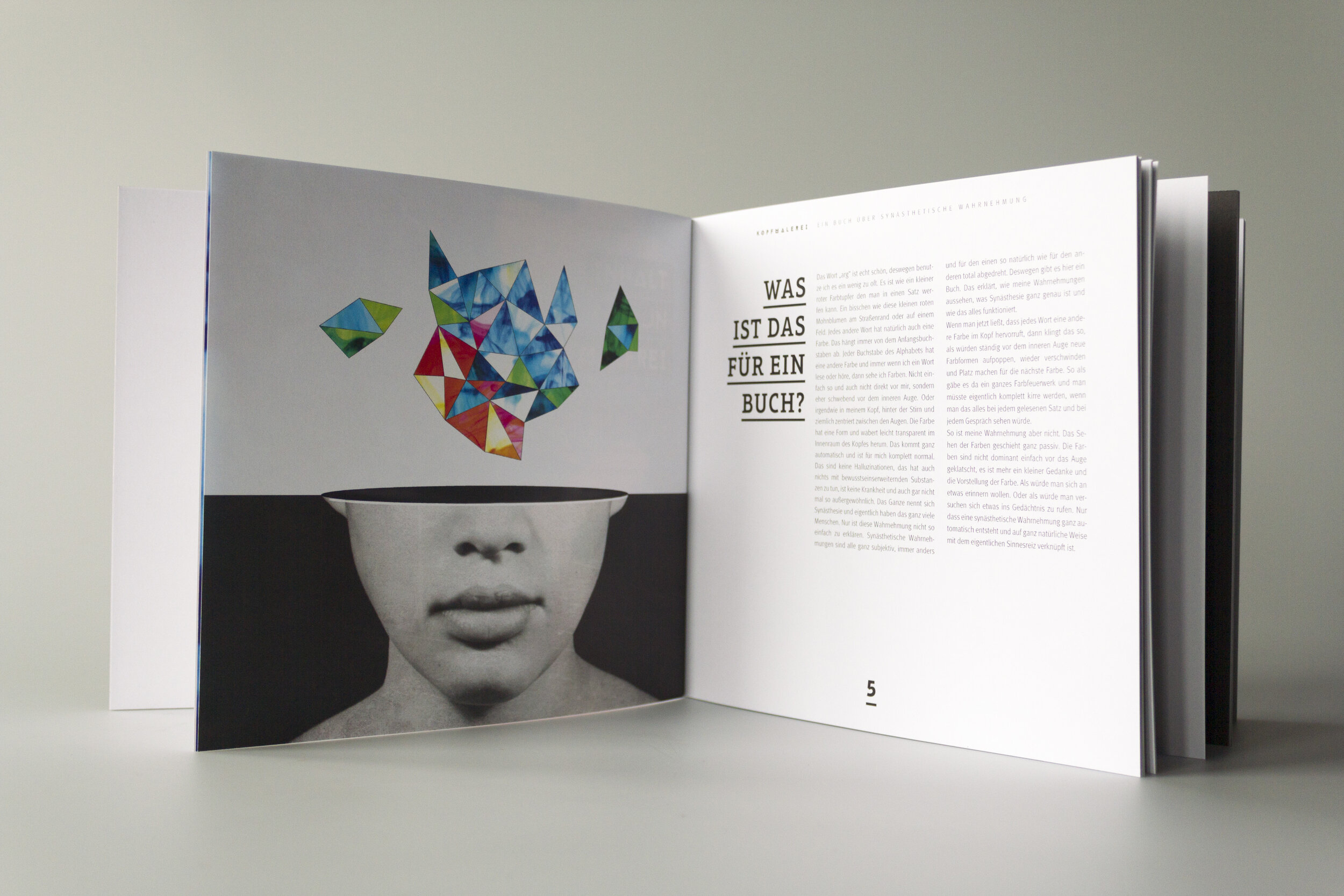“Kopfmalerei” (Multi-Sensory Experiences) is a book on synesthesia. Janine Bayer, a synesthete herself, summarises the current state of research on this psychological phenomenon, explains what synesthesia is and how colourful words look to her. The 64 pages of her thread bound, digitally printed book include illustrations, photography and of course typography, to show how her head paints letters in colours.